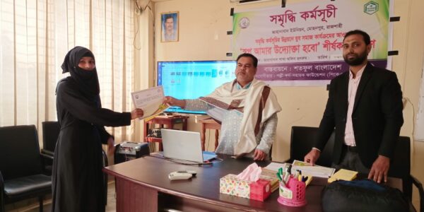 - জাহানাবাদ ইউনিয়নে সমৃদ্ধি কর্মসূচীর আওতায় স্বাস্থ্য সেবিকাদের ব্যাগ ও ছাতা বিতরণ